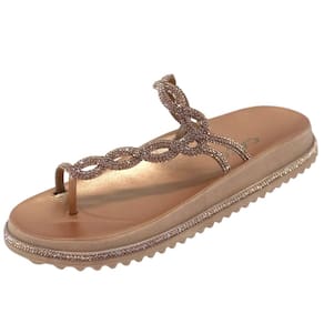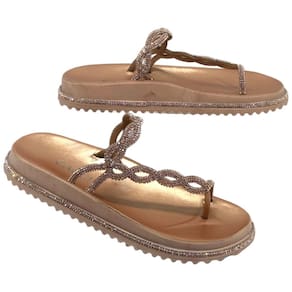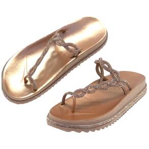 A parte superior do chinelo é onde a verdadeira beleza reside. Ela é revestida com um material metalizado de alta qualidade, conferindo um brilho sutil e um aspecto luxuoso ao calçado. As tiras são projetadas para proporcionar um ajuste seguro e confortável, enquanto adicionam um toque de glamour ao design.