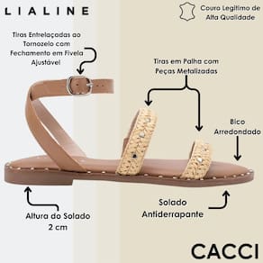 Escolha uma das melhores sandálias para seu guarda-roupas e esteja sempre linda e completa com a sandália rasteira Charllote Lia line. O contraste da tira com detalhes em palha e cristais com a palmilha natural tira essa sandália rasteira do básico, destacando-a na categoria! O design com fecho traz um visual elegante e surpreendente ao modelo, que se adaptam aos pés em calce perfeito. Essa sandália feminina vai ser uma aposta certeira para looks glamourosos e confortáveis! Com um solado com um leve salto, trás muito mais glamour e estilo para sua ocasião, aposte e esteja preparada para arrasar.