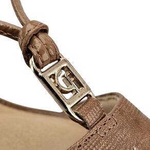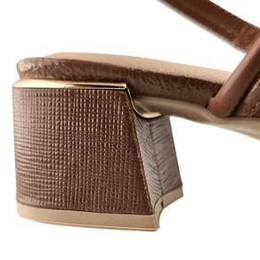 O modelo conta com fechamento em fivela, garantindo um ajuste seguro e personalizado, ideal para quem precisa de estabilidade sem comprometer a leveza. A presença do detalhe metalizado da logo marca confere um toque sofisticado, criando um visual que combina modernidade com discrição. O salto bloco, com altura de aproximadamente seis centímetros, proporciona sustentação equilibrada e firme, tornando a caminhada mais segura e confortável mesmo em períodos mais longos de uso.