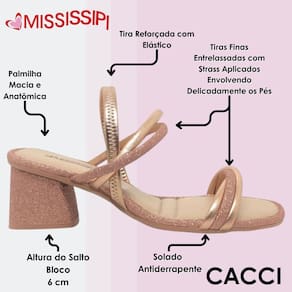 Sandália Mississipi, confeccionada em material sintético com fácil calce e tiras trançadas com a traseira em elastico garantindo a sustentabilidade aos pés, com as demais tiras com aplicações em glitter trazendo todo o charme e beleza para a sandalia, tornando-a moderna, versátil e despojada, sinônimo de conforto e bem estar.