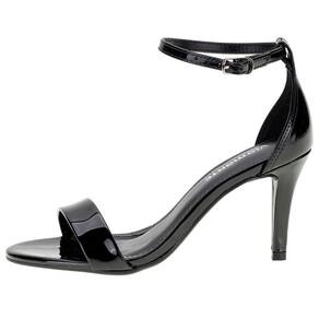 A Sandália Feminina Salto Fino Via Marte é confeccionada em material envernizado com acabamento em costura,  fechamento por fivela de ajuste,  palmilha em PU e solado em borracha antiderrapante com salto fino de oito centímetros e meio.