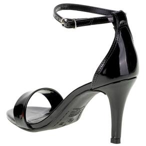 A Sandália Feminina Salto Fino Via Marte é confeccionada em material envernizado com acabamento em costura,  fechamento por fivela de ajuste,  palmilha em PU e solado em borracha antiderrapante com salto fino de oito centímetros e meio.