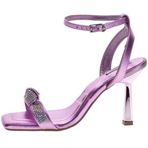 A Sandália Feminina Salto Fino Via Marte é confeccionada em material envernizado com aplicação de strass e acabamento em costura, fechamento por fivela de ajuste, palmilha em PU e solado em borracha com salto de dez centímetros.