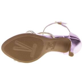 A Sandália Feminina Salto Fino Vizzano é confeccionada em material metalizado com aplicações de strass, fechamento por fivela de ajuste, palmilha em PU e solado em borracha com salto de dez centímetros.