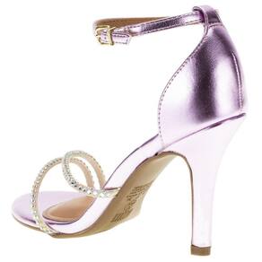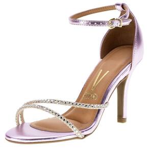 A Sandália Feminina Salto Fino Vizzano é confeccionada em material metalizado com aplicações de strass, fechamento por fivela de ajuste, palmilha em PU e solado em borracha com salto de dez centímetros.