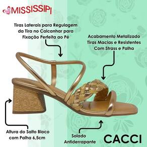 A Sandália Mississipi Casual Metalizada Salto Médio Bloco Feminina é a opção ideal para quem busca sofisticação e praticidade no dia a dia. Seu acabamento metalizado com detalhes em strass e palha cria uma combinação irresistível de elegância e frescor.