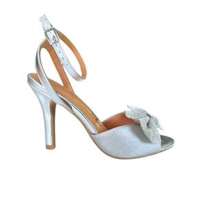 Sandália Feminina Vizzano Salto Alto Destalhe Laço Sandália Feminina Vizzano Salto Alto Destalhe Laço possui um cabedal em lona metálica, oferecendo um acabamento elegante. O material de fabricação é lona com detalhes em metal, garantindo durabilidade e estilo. O bico é simétrico, com tiras de espessura média posicionadas em sentido reto próximo aos dedos. O fechamento é feito por fivela lateral, facilitando o ajuste. A construção é delicada, com salto alto de aproximadamente 10 cm. A palmilha é acolchoada para conforto, e a calcanheira é levemente estruturada. O forro interior é em material têxtil, e o solado é em emborrachado, proporcionando aderência. O estilo é sofisticado com um design moderno e detalhes decorativos metálicos.
