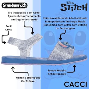 O personagem do momento em uma versão apaixonante: a sandália Stitch To Play traz um enfeite personalizado e diferente em cada um dos pés e uma sola com grafias coloridas e superdivertidas, deixando o Stitch em evidência.