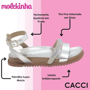 Não perca a chance de deixar os pezinhos da sua pequena ainda mais estilosos! A Sandália Molekinha é a combinação perfeita de conforto e glamour. Adquira já a sua e faça cada passo ser um momento de alegria e charme!