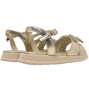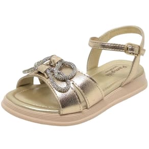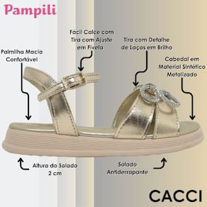 Sandália infantil feminina em sintético dourado com lacinhos em cordão de strass na parte superior, estilosa para todos os momentos. Sandália com palmilha anatômica, cuidando sempre do bem estar dos pezinhos. Solado com pequena elevação em micro expandido, material leve com muita aderência e estabilidade, além da flexibilidade, resistência térmica e alto desempenho antiderrapante. Sandália calce fácil com fechamento prático, muito prática para a autonomia das meninas ao calçar! A sandália vem com escrita em braile nas laterais, mostrando o lado correto para as meninas cegas ou com baixa visão.