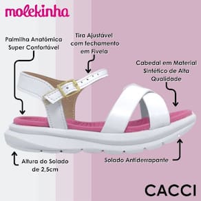 A Sandália Infantil Feminina Molekinha possui um cabedal leve e confortável, fabricado em material napa de alta qualidade. Seu formato de bico é arredondado para proporcionar conforto aos dedos. A coloração é uniforme, garantindo um visual elegante. O fechamento é por fivela ajustável, facilitando o calce. Sua construção ergonômica oferece suporte adequado aos pés durante o uso. A palmilha é macia, o forro interior é suave ao toque, proporcionando conforto prolongado. O solado emborrachado oferece durabilidade e aderência. Fácil de usar e combinar, é ideal para o dia a dia ou ocasiões especiais.