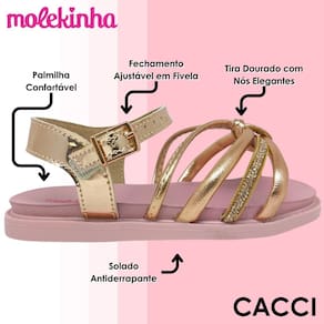 O solado antiderrapante garante firmeza e segurança em diferentes superfícies, permitindo que a criança brinque e caminhe com confiança. Leve, confortável e cheia de estilo, a sandália Molekinha é ideal para passeios, festas e momentos de lazer, proporcionando liberdade e charme em cada movimento.