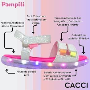 Sandália de led infantil em material tecnológico branco com efeito de foil holográfico, super moderna e descolada! Sandália estilo papete com palmilha anatômica, super confortável para cuidar dos pezinhos minimizando impactos. Sandália feminina calce fácil com fecho em fita autocolante, facilitando a rotina da menina e permitindo regulagem. Sandália infantil com solado emborrachado cristal em TR ECO, um material que leva em sua composição 20% de matérias primas vindas de fontes renováveis! Led do solado com bateria blindada para mais durabilidade e luzes em cores fortes e brilho intenso, trazendo muita diversão ao look!