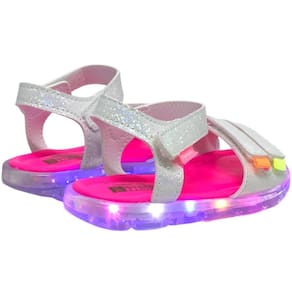 Sandália de led infantil em material tecnológico branco com efeito de foil holográfico, super moderna e descolada! Sandália estilo papete com palmilha anatômica, super confortável para cuidar dos pezinhos minimizando impactos. Sandália feminina calce fácil com fecho em fita autocolante, facilitando a rotina da menina e permitindo regulagem. Sandália infantil com solado emborrachado cristal em TR ECO, um material que leva em sua composição 20% de matérias primas vindas de fontes renováveis! Led do solado com bateria blindada para mais durabilidade e luzes em cores fortes e brilho intenso, trazendo muita diversão ao look!