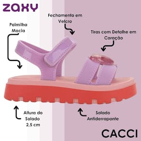 Possui fechamento por tira autocolante facilitando no calce, seu solado é antiderrapante de altura de 2,5 cm de altura ele garante conforto e estabilidade aos passos. Sandália perfeita para diversas ocasiões, seja uma festinha, um passeio e até mesmo para a escolinha.