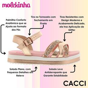 A sandália Molekinha foi criada para unir conforto, charme e estilo em um só calçado. Seu design moderno e delicado é ideal para acompanhar as pequenas em momentos de lazer, festas ou passeios, trazendo um toque especial de brilho e elegância. Cada detalhe foi pensado para proporcionar praticidade e um visual encantador que combina com diferentes looks.