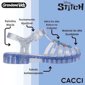 Perfeita para as pequenas que adoram estilo e praticidade, essa sandália traz o encantador personagem Stitch, deixando os passos ainda mais cheios de charme. Além disso, o fácil calce e a palmilha anatômica garantem conforto o dia todo, permitindo que sua filha brinque à vontade com total segurança.