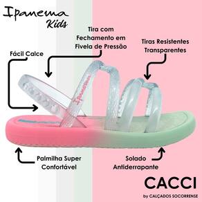 Durabilidade e Segurança: Pensando na durabilidade, a Ipanema prioriza a qualidade dos materiais para garantir uma sandália resistente e segura. A sola antiderrapante proporciona estabilidade em diferentes superfícies, permitindo que as crianças explorem o mundo com confiança.