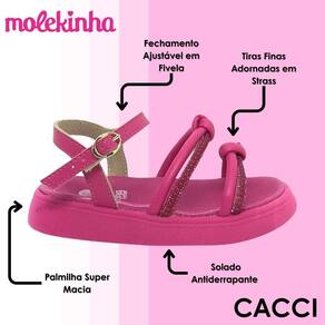 Não perca a chance de deixar os pezinhos da sua pequena ainda mais estilosos! A Sandália Molekinha é a combinação perfeita de conforto e glamour. Adquira já a sua e faça cada passo ser um momento de alegria e charme!
