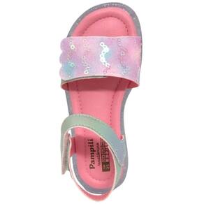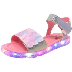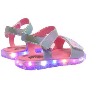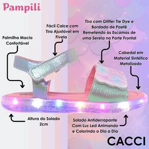 Sandália de led infantil em sintético prata holográfico, com glitter tie dye e bordado de paetê remetendo às escamas de uma sereia na parte frontal, lúdica e moderna! Sandália estilo papete com palmilha anatômica, super confortável para cuidar dos pezinhos minimizando impactos. Sandália feminina calce fácil com fecho em tira autocolante, facilitando a rotina da menina e permitindo regulagem. Sandália infantil com solado emborrachado cristal em TR ECO, um material que leva em sua composição 20% de matérias primas vindas de fontes renováveis! Led do solado com bateria blindada para mais durabilidade e luzes em cores fortes e brilho intenso, trazendo muita diversão ao look!