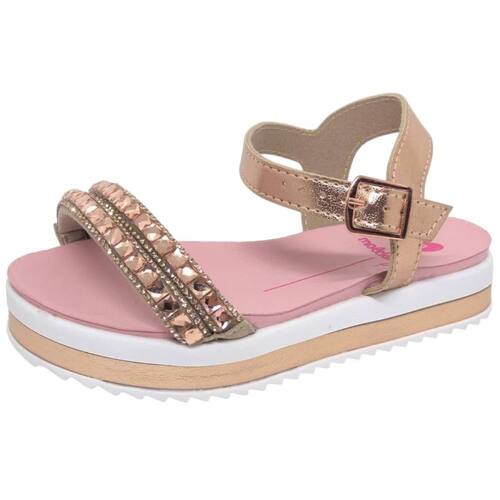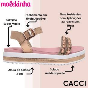 A Sandália Flatofrm Molekinha Menina possui cabedal em material sintético de alta qualidade. Seu formato apresenta bico arredondado, ideal para acomodar os pés das crianças com conforto. O fechamento é feito por ajuste prático, garantindo um ajuste firme e seguro, enquanto a abertura facilita o calce. Com construção ergonômica, a sandália oferece palmilha macia e promovendo bem-estar durante o uso. Suas tiras resistentes com aplicações de pedras de strass trazendo todo o charme ao calçado. Seu design leve e maleável permite liberdade nos movimentos, e os pequenos detalhes em costura nas laterais agregam estilo e delicadeza ao visual.