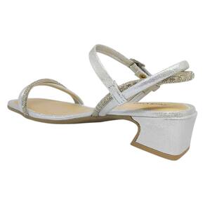 Encanto e Sofisticação – Cabedal metalizado com tiras finas macias e aplicação de strass, adicionando um toque de glamour ao look.