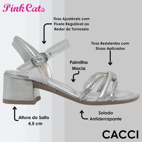 A Sandália Pink Cats Infantil une conforto e estilo. Seu design moderno e cheio de personalidade, com salto de 4,5 cm e fechamento ajustável no tornozelo, proporciona um visual sofisticado. O destaque fica por conta do revestimento das tiras da parte frontal com uma linha de strass, que adicionam um toque de delicadeza e tendência ao modelo.