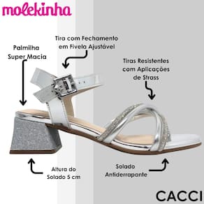A Sandália de Salto Molekinha Infantil Menina possui cabedal em material sintético de alta qualidade. Seu formato apresenta bico arredondado, ideal para acomodar os pés das crianças com conforto. O fechamento é feito por ajuste prático, garantindo um ajuste firme e seguro, enquanto a abertura facilita o calce. Com construção ergonômica, a sandália oferece palmilha macia e promovendo bem-estar durante o uso. Suas tiras resistentes com aplicações de strass trazendo todo o charme ao calçado. Seu design leve e maleável permite liberdade nos movimentos, e os pequenos detalhes em costura nas laterais agregam estilo e delicadeza ao visual.