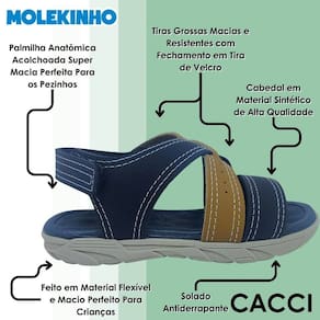 O solado antiderrapante garante estabilidade em diferentes superfícies, permitindo que as crianças brinquem, corram e se movimentem com liberdade e segurança. Leve e flexível, essa sandália é perfeita para acompanhar os meninos em todas as ocasiões, desde os passeios em família até as brincadeiras do dia a dia. Molekinho é sinônimo de conforto e estilo para os pequenos que estão sempre prontos para se divertir.