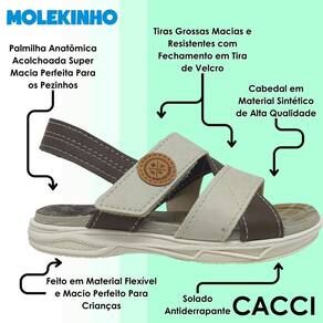 Seu cabedal é produzido em material sintético de alta qualidade, garantindo durabilidade e um toque suave no contato com os pés. As tiras grossas são macias e resistentes, com fechamento prático que facilita o ajuste, proporcionando um encaixe perfeito e seguro. A palmilha anatômica e acolchoada oferece uma sensação de conforto a cada passo, cuidando dos pezinhos durante todo o dia.