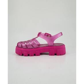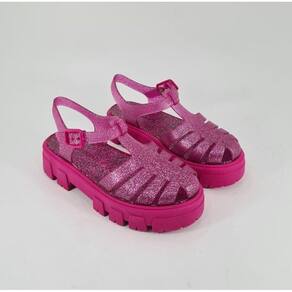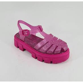 O material do cabedal é rosa translucido e possui glitter rosa pink.