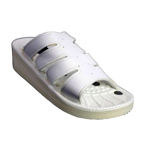 Detalhe Técnico: Sandália Feminina com Salto Charme – Couro sintetico Branco Flotter com tecnologia em reflexologia e magnetoterapia. A Sandália Charme foi desenvolvida para oferecer elegância, estabilidade e benefícios integrados ao uso diário. Produzida em Couro sintetico Branco Flotter, de textura macia e toque suave, seu cabedal envolve os pés com firmeza e conforto, proporcionando excelente ajuste anatômico, sem pontos de pressão. O modelo possui salto e estruturado, que favorece o alinhamento postural e distribuição equilibrada do peso corporal, ideal para quem busca sofisticação sem comprometer a saúde dos pés. A palmilha é anatomicamente desenhada com saliências distribuídas conforme os pontos de reflexologia podal e da técnica oriental Doin, estimulando a planta dos pés a cada passo. Esse estímulo contínuo atua de forma direta na melhora da circulação periférica, no relaxamento muscular e no alívio de tensões acumuladas. Além disso, a base conta com magnetos estrategicamente posicionados, aplicando a magnetoterapia passiva, que favorece o equilíbrio energético, redução de inchaços, oxigenação dos tecidos e recuperação muscular. Características Técnicas: Material: Couro sintetico Branco Flotter – macio, resistente e com acabamento natural Palmilha anatômica: com saliências para reflexologia e estímulo Doin Tecnologia magnética: 14 magnetos distribuídos conforme pontos de podologia energética Salto firme e com boa base de apoio Solado: EVA leve, com absorção de impacto e aderência Indicação: Uso diário; ideal para quem busca conforto, alívio de dores plantares e estimulação contínua.