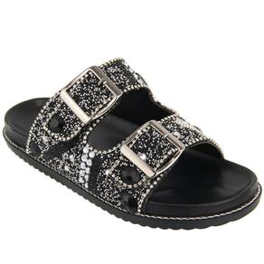 Sandália Papete Rasteira Pedrarias Fivela Ajustável Feminina Moda Fashion Passeio Sola Borracha - 33 - Preto