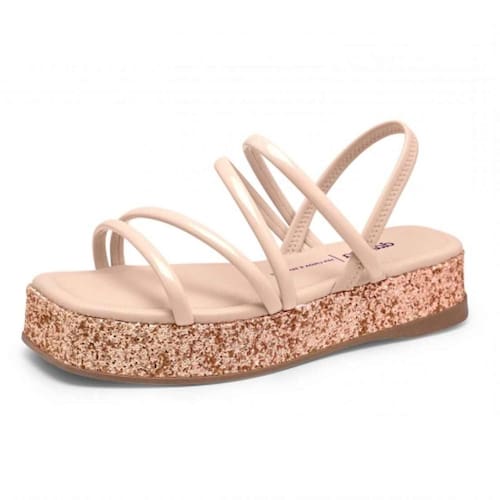 A sandália apresenta uma plataforma elevada, o que significa que a sola é mais espessa na região da frente em comparação com o calcanhar. Essa característica proporciona uma altura extra sem comprometer o conforto, pois distribui a pressão ao longo do pé.