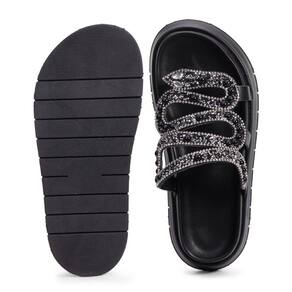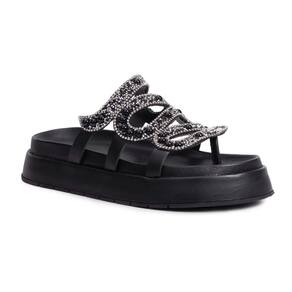 Sandália Plataforma Flat Feminina Pedrarias Chatons Moda Casual Passeio Dia a Dia Mulher Elegante - 40 - Preto