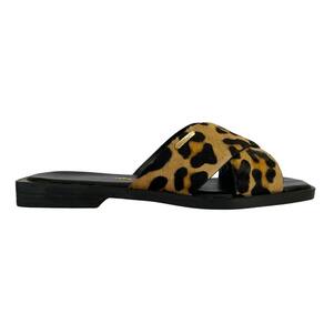 Sandália rasteira em couro poney com estampa animal print de leopardo. Com design moderno e toque de sofisticação, o modelo conta com gáspea composta por tiras largas transpassadas sobre o peito do pé, oferecendo firmeza e estilo. O salto rasteiro em acabamento preto possui 2 cm de altura, ideal para quem busca conforto no dia a dia sem abrir mão da elegância. O calce é prático e funcional, com palmilha macia que garante maior conforto ao caminhar. O logo da marca aparece em dourado na palmilha e também em um pin metálico aplicado na lateral externa, conferindo um detalhe delicado e exclusivo à peça. Com peso aproximado de 326 g (par no tamanho 36), é uma sandália leve, versátil e perfeita para composições descontraídas — do casual ao urbano chic. Garanta já a sua.