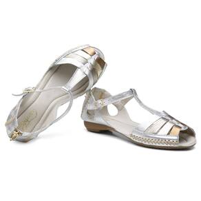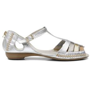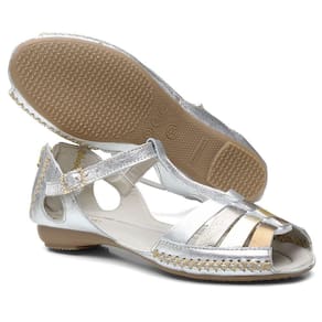 Sandalia Rasteira Conforto Feminina Couro Tiras Coloridas Salto Baixo Fechamento Ziper e Fivela - 38 - Prata