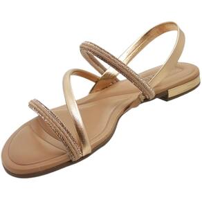 Confeccionada com material sintético de alta qualidade, garantindo não apenas beleza, mas também durabilidade para acompanhar você em todas as suas jornadas. Seu design apresenta uma biqueira arredondada e um cabedal aberto, composto por três tiras finas e elegantes. O toque de sofisticação vem das duas tiras decoradas com brilhantes strass, que adicionam um charme sutil e um brilho cativante ao seu visual.