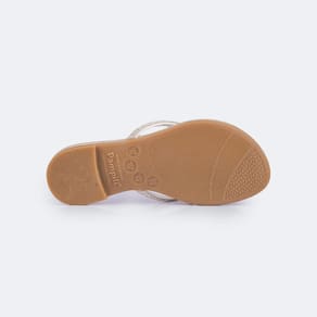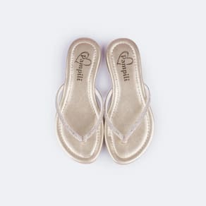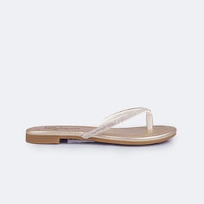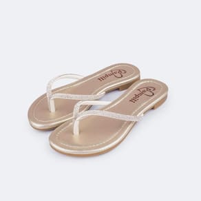 Rasteirinha infantil dourada com tiras superiores em strass, perfeita para acompanhar a menina nos dias quentes de verão! Sandália rasteira com palmilha forrada em espuma, para mais conforto ao caminhar. Sandália de dedo com solado em TR Eco, contendo em sua composição 20% de matérias primas vindas de fontes renováveis, entregando uma performance flexível e antiderrapante.