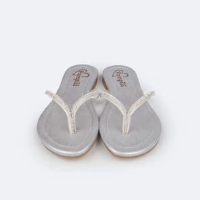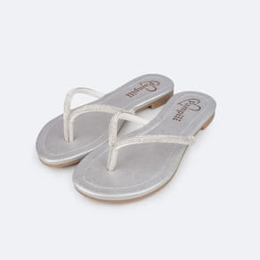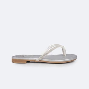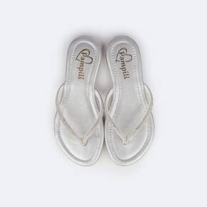 Rasteirinha infantil prata com tiras superiores em strass! Sandália rasteira com palmilha forrada em espuma, para mais conforto ao caminhar. Sandália de dedo com solado em TR Eco, contendo em sua composição 20% de matérias primas vindas de fontes renováveis, entregando uma performance flexível e antiderrapante.