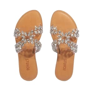 Essa sandália rasteira combina a praticidade do modelo slide com o glamour da aplicação de pedras sobre o vinil transparente, material que adiciona um toque trendy ao visual. Sabe aquele modelo fácil de usar e que faz toda a diferença no look? É essa sandália glam!