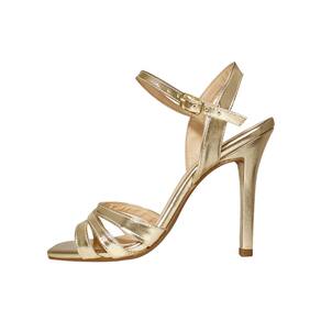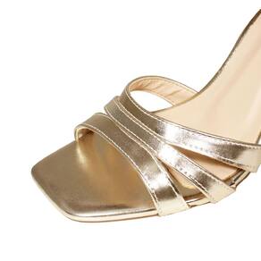 Linha de Sandália Salto Alto Fino Luiza Sobreira, produzida em material sintético na cor Dourada, com palmilha e forro em P.U., solado em TR, bico quadrado e fivela ajustável para fechamento.