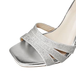 Linha de Sandália Salto Alto Fino Luiza Sobreira, produzida em material sintético na cor Gliter Prata, com palmilha e forro em P.U., solado em TR, bico quadrado e fivela ajustável para fechamento.