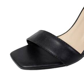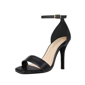 Linha de Sandália Salto Alto Fino Luiza Sobreira, produzida em material sintético na cor Preta, com palmilha e forro em P.U., solado em TR, bico quadrado e fivela ajustável para fechamento.
