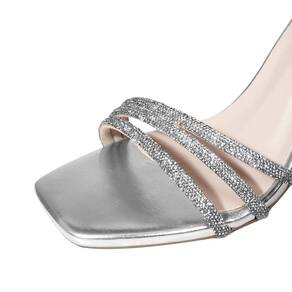 Linha de Sandália Salto Alto Fino Luiza Sobreira, produzida em material sintético metalizado na cor Prata com detalhes em strass, com palmilha e forro em P.U., solado em TR, bico quadrado e fivela ajustável para fechamento.