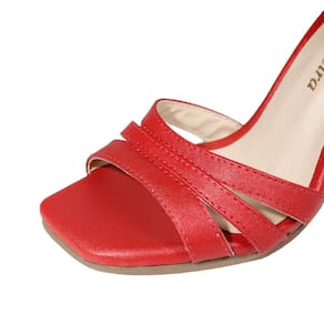 Linha de Sandália Salto Alto Fino Luiza Sobreira, produzida em material sintético na cor Vermelha, com palmilha e forro em P.U., solado em TR, bico quadrado e fivela ajustável para fechamento.