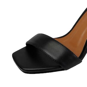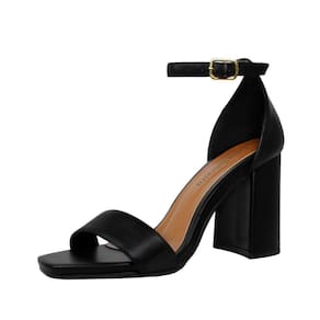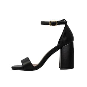 Linha de Sandália Salto Alto Grosso Luiza Sobreira, produzida em material sintético na cor Preta, com palmilha e forro em P.U., solado em TR, bico quadrado e fivela ajustável para fechamento..