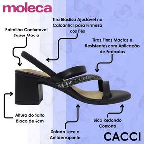 Seu cabedal é fabricado em material sintético, tem no peito do pé 3 tiras e uma decorada com strass. O salto é médio, bloco e acabamento no mesmo material do cabedal, possui aproximadamente 5 cm de altura é estável proporcionando conforto ao caminhar, o solado é emborrachado e possui frisos para maior segurança, a palmilha é fixa, almofadada e apresenta a logo da marca, o calcanhar é aberto e o fechando é por tira melavél no tornozelo facilitando o calçe.