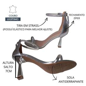 Sandália Feminina Salto Fino Alto Prata Metalizada confeccionada em couro, possuí traseira fechada e tira com aplicação em strass, fechamento por zíper. As tiras de strass adicionam um toque de brilho e sofisticação, tornando esta sandália um verdadeiro acessório de destaque. Possuí palmilha macia, solado emborrachado com frisos antiderrapantes para garantir maior segurança e conforto ao caminhar. Material - Couro*Sola - Expandida, Emborrachada, Anti-derrapante, Não faz barulho, Não escorrega, macia.*Altura do salto - 7 cm.*Palmilha - Confortável com aplique da logo. *Tiras em Strass - possuí elástico para melhor ajuste na canela. *Forma normal, pegar o tamanho que usa normalmente.Medida aproximada dos pés para cada numeração:Tamanho 33 --- 22,2 cmTamanho 34 --- 22,5 cmTamanho 35 --- 24 cmTamanho 36 --- 24,5 cmTamanho 37 --- 25,0 cmTamanho 38 --- 25,5 cmTamanho 39 --- 26,0 cm Tamanho 40 --- 26,5 cm