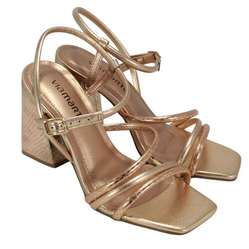 Descrição: Este modelo de sandália Via Marte tem salto alto geométrico e bico quadrado. Duas tiras que saem da lateral do pé, envolvem o tornozelo e terminam com fechamento em fivela. Sobre os dedos passam duas tiras confortáveis. O peito do pé é envolvido por uma tira confortável em diagonal.